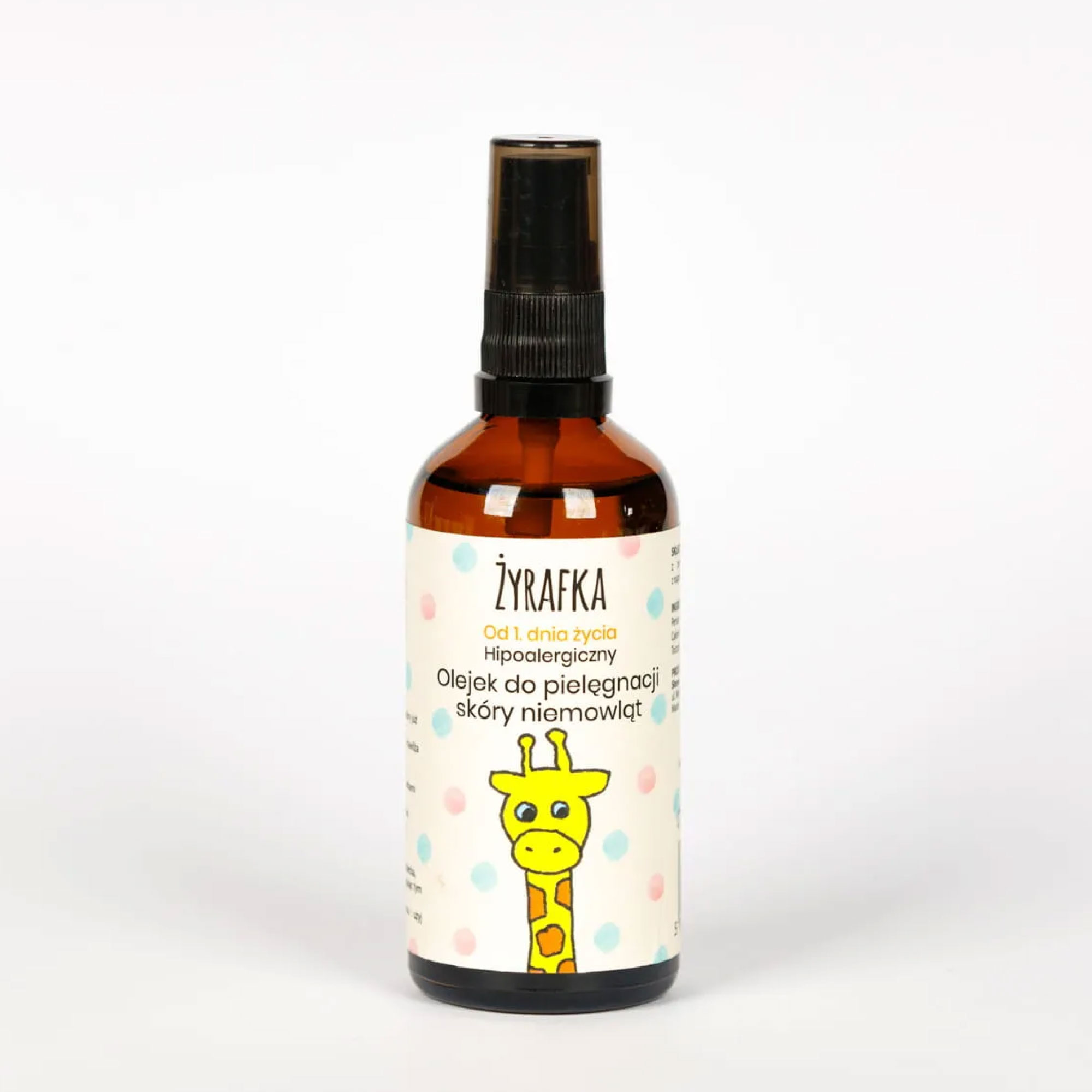 Żyrafka, Hipoalergiczny olejek do pielęgnacji skóry niemowląt z przeznaczeniem od pierwszego dnia życia. Najcenniejszym składnikiem olejku jest macerat z nagietka. Kwiat nagietka pochodzi z prywatnego gospodarstwa, które ma 120 hektarów ekologicznych upraw ziół na Podlasiu. Nagietek to panaceum na wszelkie możliwe problemy i najlepsza ochrona skóry.